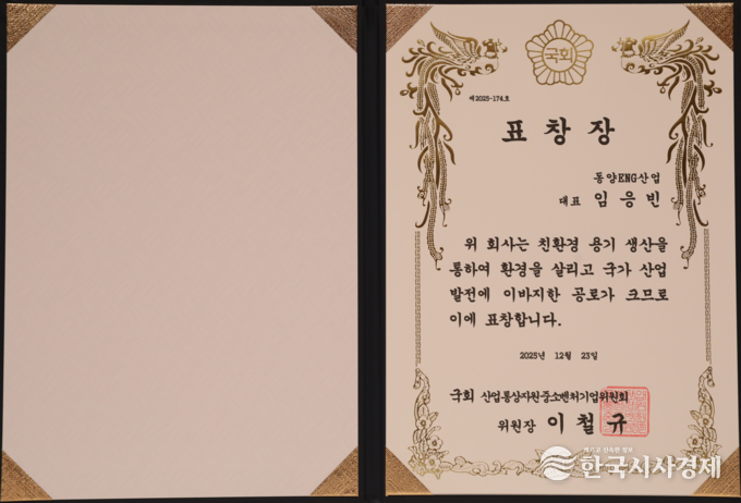 한국시사경제 권충언 기자 | 동양ENG산업 임응빈 대표가 2025년 12월 23일 한국프레스센터에서 한국시사경제 • 코리아타임뉴스(윤광희 회장)주최, SBS • 기획재정부 • 교육부 • 문화체육관광부 • 농림축산식품부 • 산업통상부 • 기후에너지환경부 • 고용노동부 • 해양수산부 • 중소벤처기업부 후원으로 열린 ‘2025 대한민국 글로벌파워브랜드 대상(GPBA) 및 국회 상임위원장 표창 시상식’ 에서 임응빈 대표가 대상과 국회 산업통상자원중소벤처기업위원장 표창을 수상했다.