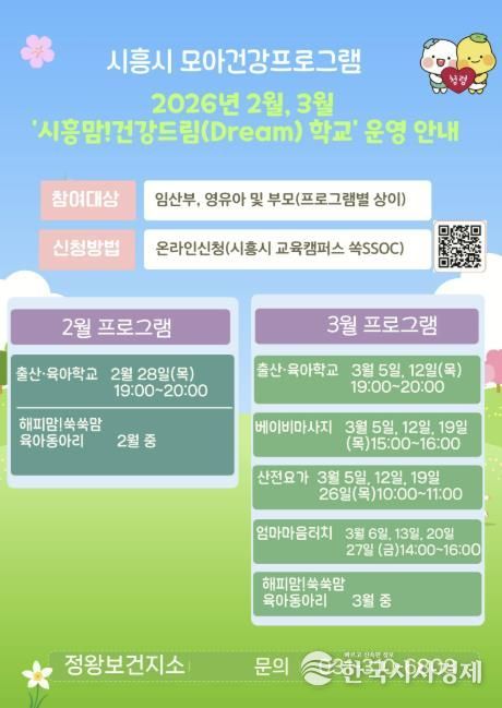 이번 프로그램은 2월부터 5월까지 정왕보건지소에서 운영되며, 4개 분야ㆍ12종 강좌를 총 89회 운영할 계획이다. 분야별 주요 강좌는 ▲(임신ㆍ출산ㆍ육아 분야) 출산ㆍ육아학교, 오감태교, 모유수유클리닉, 베이비 마사지, 오감놀이 ▲(운동 분야) 산전요가, 산후필라테스 ▲(심리 분야) 산전ㆍ산후 우울 예방 미술치료와 심리 테라피 프로그램이 있다.