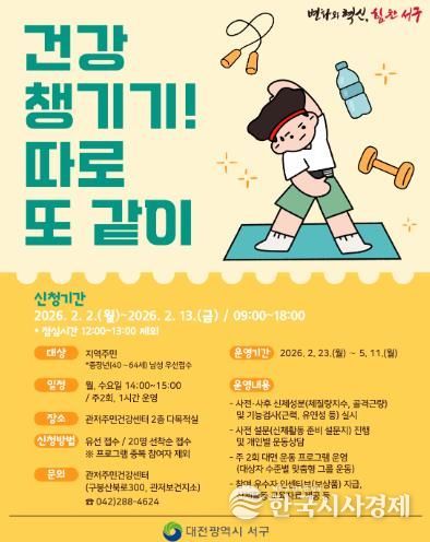 한국시사경제 대전취재본부 | 대전 서구 관저주민건강센터는 이달 13일까지 맞춤형 건강 증진 운동 프로그램 ‘건강 챙기기! 따로 또 같이’ 참여자를 모집한다.