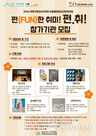 한국시사경제 사회팀 | 부평구청소년수련관은 2026년 사회배려청소년지원사업 ‘펀(fun)한 취미, 펀.취!’에 참여할 기관을 모집한다고 밝혔다.