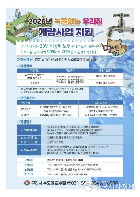 한국시사경제 경기북부취재본부 | 구리시는 2026년 수도관 개량 공사비 지원 사업의 신청을 오는 2월 2일부터 접수한다고 밝혔다.