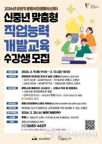 한국시사경제 경기취재본부 | 광명시 인생플러스센터는 신중년의 취업 경쟁력을 높이고 성공적인 인생 재도약을 지원하기 위해 오는 13일까지 ‘2026년 상반기 신중년 맞춤형 직업능력개발교육과정’ 수강생을 모집한다.
