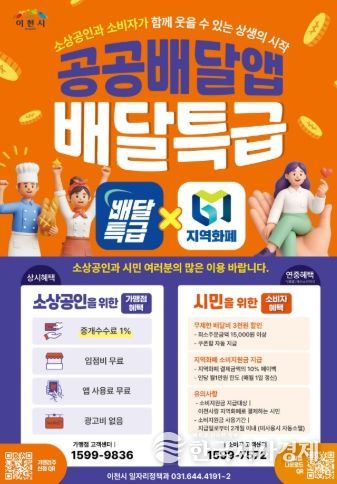 경기도 공공배달앱 ‘배달특급’의 가맹점 혜택인 ▲중개수수료 1%, ▲광고비·입점비·사용료 무료 및 이천시 단독 소비자 혜택인 ▲무제한 배달비 3,000원 할인(15,000원 이상 주문 시), ▲이천사랑 지역화폐 결제 시 결제금액의 10% 페이백(인당 월 1만원 한도) 등을 홍보한다.