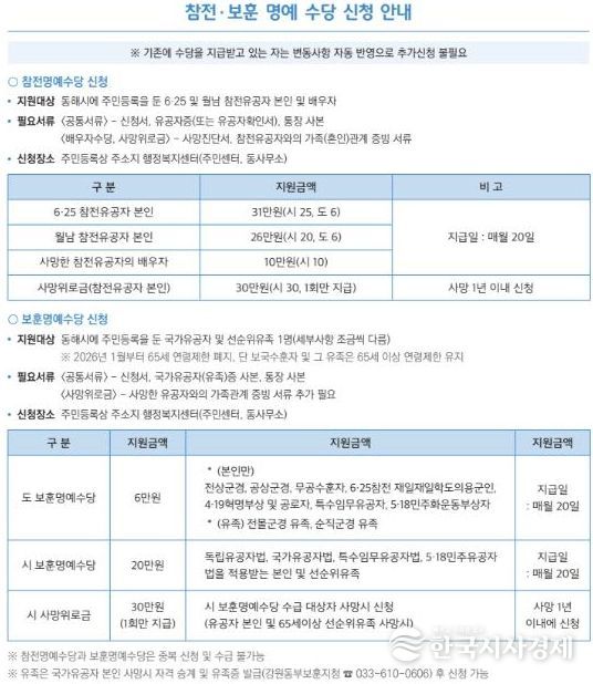 시는 2026년 1월부터 보훈 관련 수당을 인상해 경제적 지원을 확대하는 한편, 6.25 전쟁 및 월남전 참전 기념탑 건립 등 호국 정신을 기리는 보훈 선양 사업을 본격 추진할 계획이다.
