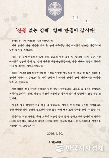 한국시사경제 노승선 기자 | 김해시는 건조한 날씨에 산불 발생 위험이 증가하고 있어 시민들의 적극적인 협조를 당부하는 시장 서한문을 사회단체와 산불취약지역 주민에게 발송했다고 3일 밝혔다.