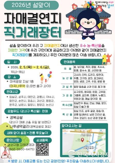 한국시사경제 기동취재팀 | 서울 강서구가 오는 5일부터 6일까지 이틀간 ‘설맞이 직거래장터’를 운영한다고 밝혔다.