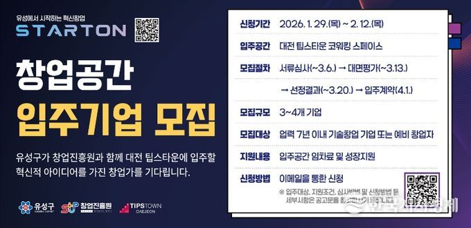 최종 선정된 기업은 대전 팁스타운 내 공간을 이용할 수 있으며, 임차료를 지원받는다. 이와 함께 유성구와 창업진흥원이 추진하는 상담·멘토링과 각종 창업 지원 사업에 참여할 기회도 제공된다.