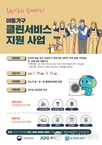 한국시사경제 기동취재팀 | 경기도에서 열악한 주거환경에 거주하는 아동가구들을 위한 ‘아동가구 클린서비스 지원 사업’을 복권기금과 함께 추진한다.
