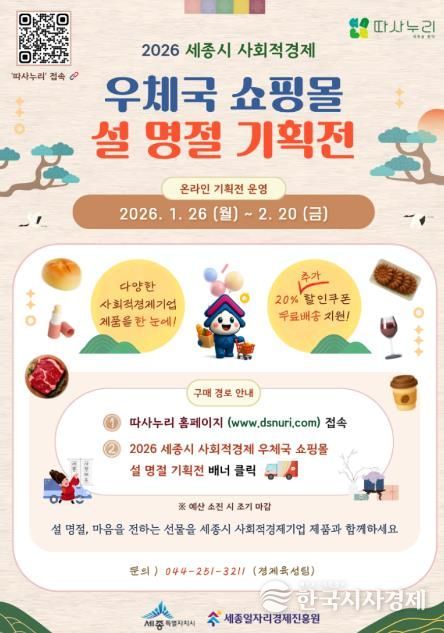 한국시사경제 세종취재분부 | 세종일자리경제진흥원이 설 명절을 맞아 세종시 사회적경제기업의 온라인 판로 확대와 매출 증대를 위해 ‘2026년 세종시 사회적경제 우체국쇼핑몰 온라인 설 기획전’을 운영한다고 밝혔다.
