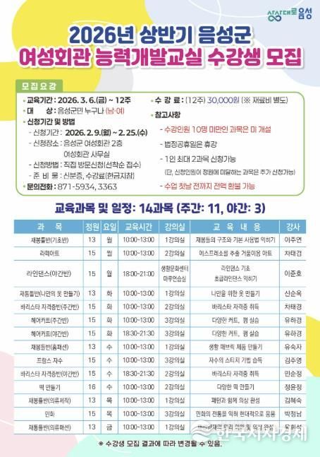 한국시사경제 오영주 기자 | 음성군은 2026년 상반기 여성회관 능력개발교실 수강생을 모집한다.
