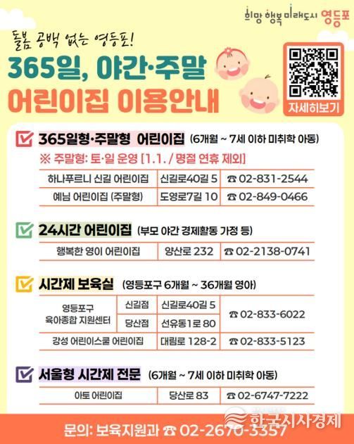 ‘영등포형 시간제 어린이집’은 맞벌이 가정이나 야간근무 등으로 발생하는 보육 공백을 줄이기 위한 영등포구의 맞춤형 돌봄 사업이다. 부모의 생활시간에 맞춰 ▲365일형 어린이집 ▲24시간 어린이집 ▲시간제 보육실 등 다양한 보육 서비스를 제공하고 있다
