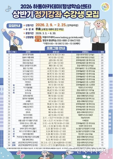 한국시사경제 경남취재본부 | 하동군이 오는 2월 9일부터 25일까지 ‘2026년 상반기 하동아카데미(평생학습센터) 프로그램’ 수강생을 모집한다고 밝혔다.