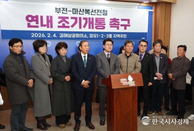 한국시사경제 노승선 기자 | 김해시 상공계와 시민들은 4일 오전 11시 김해시청 브리핑룸에서 부전-마산복선전철의 연내 조기 개통을 강력 촉구했다.