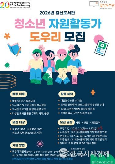 한국시사경제 사회팀 | 부평구립 갈산도서관은 오는 27일까지 청소년 자원활동가 ‘도우리’를 모집한다고 밝혔다.