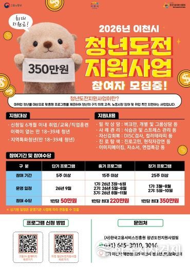 한국시사경제 기동취재팀 | 이천시는 지역 내 미취업 청년들의 진로 탐색과 취업역량 강화를 위해 운영하는 ‘청년도전지원사업’의 참여자를 2월 4일부터 모집한다고 밝혔다.