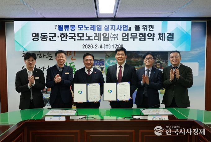 영동군은 4일 오후 군청 상황실에서 한국모노레일㈜과 월류봉 모노레일 설치를 위한 업무협약(MOU)을 체결하고, 민·관 협력을 바탕으로 관광 인프라를 확충해 체류형 관광 활성화에 나선다고 밝혔다.