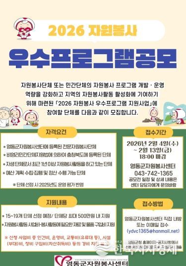 한국시사경제 충북취재본부 | 충북 영동군은 자원봉사단체와 민간단체의 자원봉사 프로그램 개발·운영 역량을 강화하고 지역 자원봉사 활성화를 도모하기 위해 ‘2026년 자원봉사 우수프로그램 지원사업’에 참여할 단체를 모집한다.