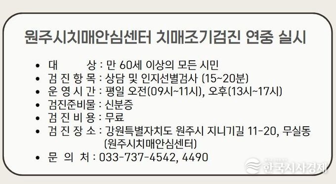 한국시사경제 권충언 기자 | 원주시치매안심센터는 치매 조기 발견과 적기 치료를 위해 지역 내 60세 이상 주민을 대상으로 치매 조기 검진 사업을 연중 실시하고 있다.