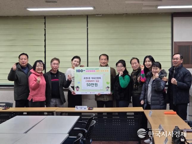 한국시사경제 경기북부취재본부 | 의정부시 호원1동주민센터는 2월 2일 호원1동 체육진흥회가 ‘100일간 사랑릴레이 배턴 잇기’에 동참해 성금 50만 원을 기부했다고 밝혔다.
