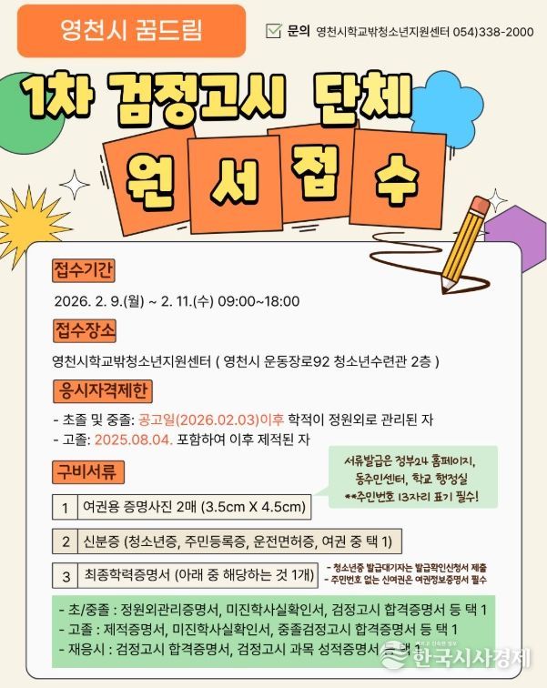 한국시사경제 문화팀 | 영천시학교밖청소년지원센터는 학교 밖 청소년의 학력 취득을 지원하기 위해, 오는 4월 4일 실시 예정인 2026년 제1회 초·중·고등학교 졸업학력 검정고시와 관련해 원서접수 대행 서비스를 9일부터 11일까지 운영한다고 밝혔다.