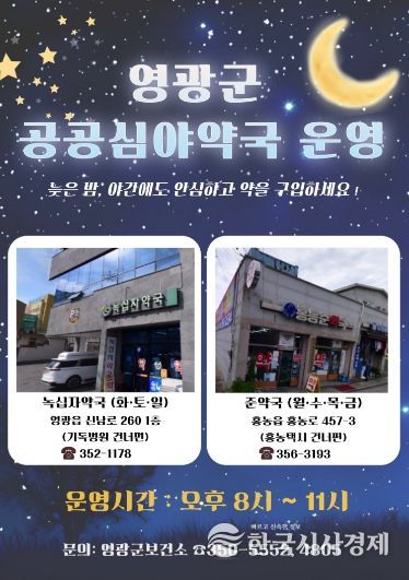 한국시사경제 의료보건팀 | 영광군은 오는 2월 9일부터 공공심야약국 2개소를 지정하여 매일 오후 8시부터 11시까지 운영한다고 밝혔다.