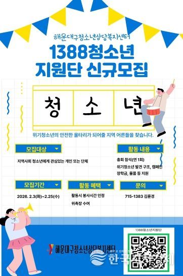 한국시사경제 김숙영 기자 | 해운대구 청소년상담복지센터는 지역 내 위기청소년들을 조기에 발견하고 든든한 울타리가 되어줄 ‘1388청소년지원단’을 이달 25일까지 공개 모집한다고 밝혔다.