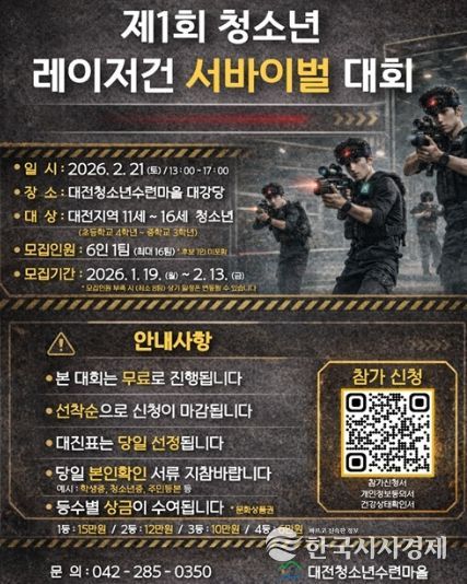 한국시사경제 대전취재본부 | 대전청소년수련마을은 지역 청소년의 건강한 여가문화 조성과 협동심 함양을 위해 ‘제1회 레이저건 서바이벌 대회’를 21일 개최한다.