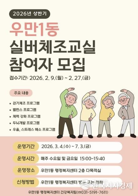 한국시사경제 사회팀 | 수원시 팔달구 우만1동은 관내 어르신들의 건강 증진을 위해 2월 9일부터 2월 27일까지 ‘2026년 상반기 실버체조교실’ 참여자를 선착순으로 모집한다고 밝혔다.