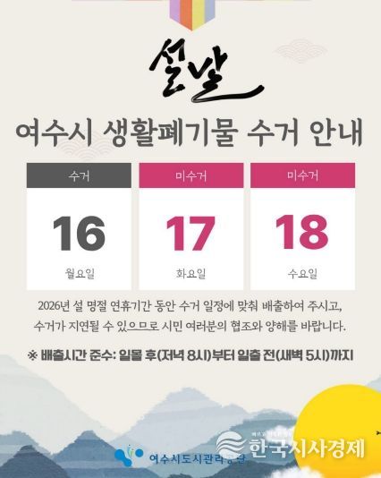한국시사경제 사회팀 | 여수시도시관리공단(이사장 송병구)은 2026년 설 명절을 앞두고 귀성객과 관광객이 증가할 것으로 예상됨에 따라, 쾌적하고 깨끗한 도시환경 조성을 위해 여수시 전역을 대상으로 '설 명절 대비 청소종합 대책'을 시행한다고 6일 밝혔다.