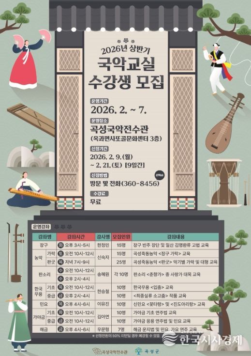 한국시사경제 이정이 기자 | 전남 곡성군은 곡성국악전수관에서 운영하는‘2026년 상반기 국악교실’수강생을 모집한다고 6일 밝혔다.