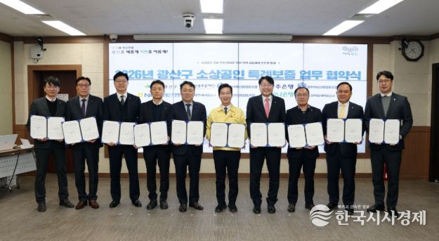 한국시사경제 광주취재본부 | 광주 광산구가 6일 구청 2층 회의실에서 광주신용보증재단(이사장 염규송), 지역 금융기관 8개소(△광주어룡신협·광주하남신협·우산신협 △광주은행 △하나은행 △농협△서광주새마을금고·한마음새마을금고)와 함께 ‘2026년 광산구 소상공인 특례보증 업무협약’을 체결했다.
