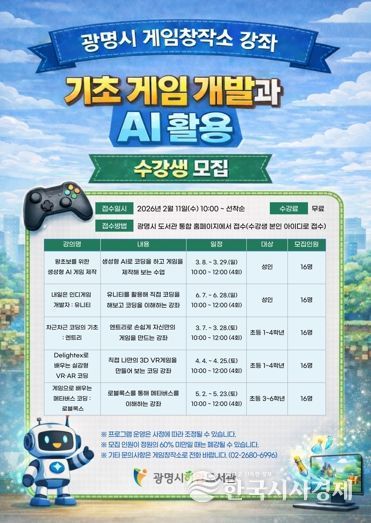 한국시사경제 경기취재본부 | 광명시 게임창작소는 오는 11일 오전 10시부터 상반기 시민 교육 프로그램인 ‘기초 게임 개발과 인공지능(AI) 활용’ 강좌의 수강생을 모집한다.