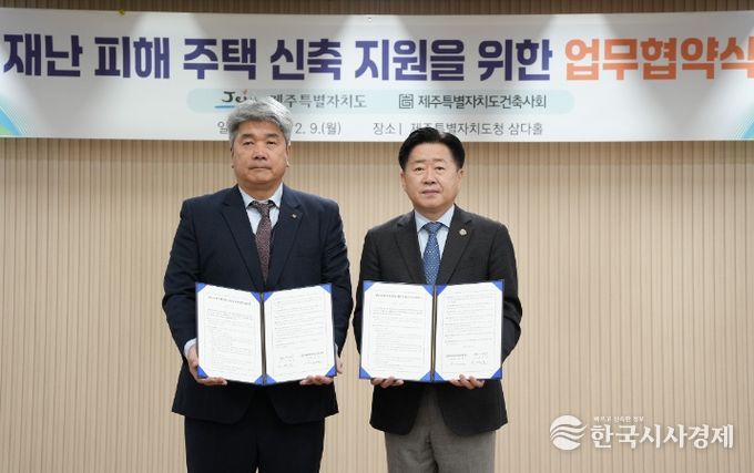 제주도는 9일 도청 삼다홀에서 대한건축사협회 제주도 건축사회와 ‘재난 피해주택 신축 지원을 위한 업무협약(MOU)’을 체결했다. 재난 피해 주택의 신속한 복구와 피해 주민의 경제적 부담 완화가 목표다.
