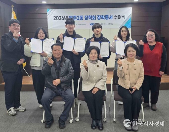한국시사경제 김숙영 기자 | 부산 중구 영주2동 장학회(이사장 정미옥)는 지난 6일 2026년 장학생으로 선정된 대학생 4명에게 장학증서와 장학금 400만원(1인당 100만원)을 전달했다.