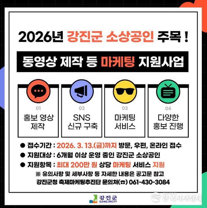 한국시사경제 경제팀 | 강진군이 2026년에도 관내 소상공인을 대상으로 동영상 제작 등 마케팅 지원사업 대상자를 모집한다.