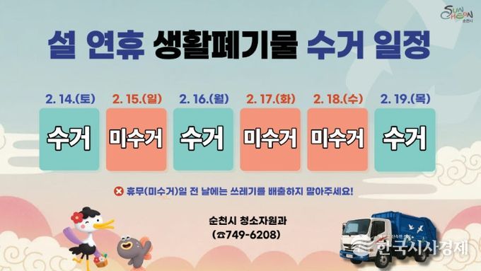 한국시사경제 전남취재본부 | 순천시는 설 연휴 기간 생활폐기물로 인한 시민 불편을 최소화하고 쾌적한 도시환경을 조성하기 위해 생활폐기물 수집·운반체계를 안정적으로 운영한다고 밝혔다.