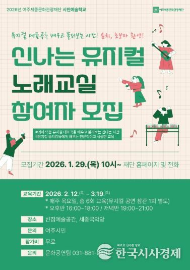 한국시사경제 이정이 기자 | 여주세종문화관광재단은 오는 12일부터 시민예술학교 프로그램의 일환으로 ‘신나는 뮤지컬 노래교실’을 운영한다.