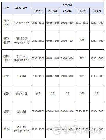 권역응급의료센터 등 주요 응급의료기관의 과부하를 줄이고 경증 환자의 외래 진료 공백을 최소화하기 위해, 연휴 기간 하루 평균 의료기관 459개소와 약국 240개소가 운영된다. 특히 소아 응급환자 진료 공백을 최소화하기 위해 예수병원 소아전문응급의료센터는 24시간 운영되며, 달빛어린이병원과 원광대학교병원 권역응급의료센터 소아진료실도 정상 운영된다.