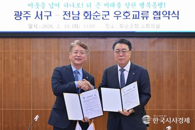 한국시사경제 광주취재본부 | 광주광역시 서구는 10일 전라남도 화순군청에서 화순군과 우호교류 협약을 체결하고 생활권을 공유하는 이웃 지자체 간 협력과 공동발전을 위한 상생 체계를 구축하기로 했다.