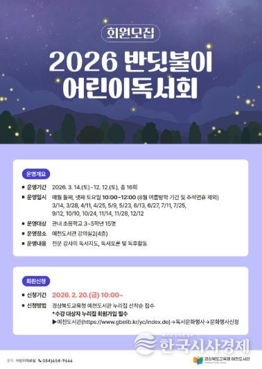 한국시사경제 경북취재본부 | 경상북도교육청 예천도서관은 이달 2월 20일부터 예천군 관내 초등학교 3~5학년을 대상으로 2026년 반딧불이 독서회원을 모집한다.