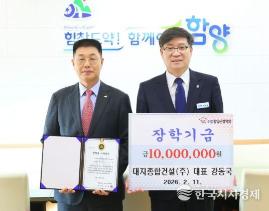 한국시사경제 경남취재본부 | (재)함양군장학회는 2월 11일 대지종합건설(주) 강동국 대표가 함양군 지역 학생들을 위해 장학금 1,000만 원을 기탁했다고 밝혔다.
