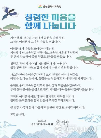 한국시사경제 울산취재본부 | 울산광역시교육청은 설 명절을 앞둔 12일 울산 지역 전 교육기관과 학교 교직원에게 청렴 의지를 다지는 ‘청렴 서한문’을 보냈다.