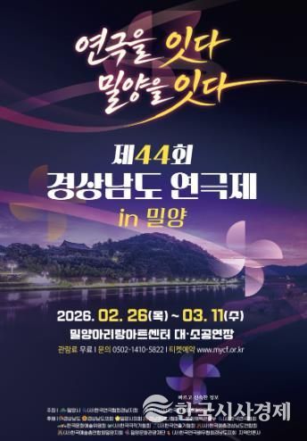 한국시사경제 경남취재본부 | 밀양시는 경남 연극인들의 최대 축제이자 경연대회인 ‘제44회 경상남도 연극제’가 오는 2월 26일부터 3월 11일까지 14일간 밀양아리랑아트센터에서 개최된다고 밝혔다.