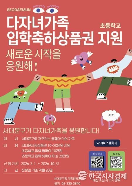 한국시사경제 노승선 기자 | 서대문구가 다자녀 가정을 위하는 사회 분위기 조성의 일환으로 ‘다자녀가족 초등학교 입학축하 상품권 지원 사업’을 3월부터 시행한다.