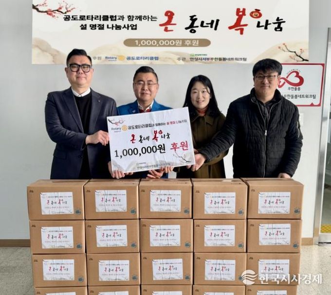 한국시사경제 경기취재본부 | 사회복지법인 한길복지재단이 수탁 운영하는 안성시서부무한돌봄네트워크팀은 국제로타리 3600지구 공도로타리클럽과 지난 12일 설 명절 나눔사업 ‘온동네 복나눔’ 후원금 100만 원 전달식을 가졌다.