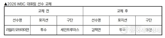 한국시사경제 스포츠팀 | KBO 전력강화위원회는 부상으로 인해 WBC 참가가 어려워진 세인트루이스 라일리 오브라이언을 대체할 선수로 두산 김택연을 확정하고 WBC 조직위에 선수 교체 승인을 요청했다.