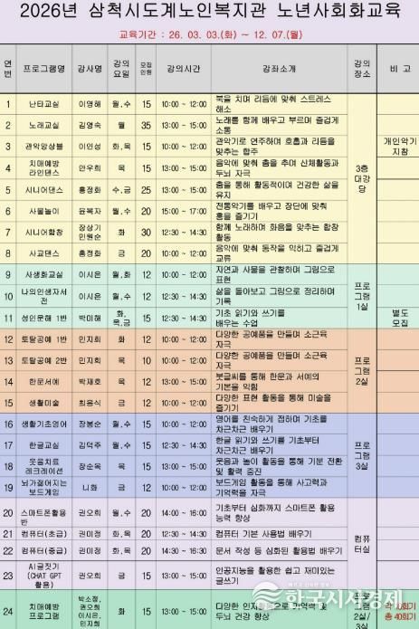 한국시사경제 권충언 기자 | 삼척시도계노인복지관은 2026년도 노년사회화교육 프로그램 개강을 앞두고 수강생 모집을 시작했다.