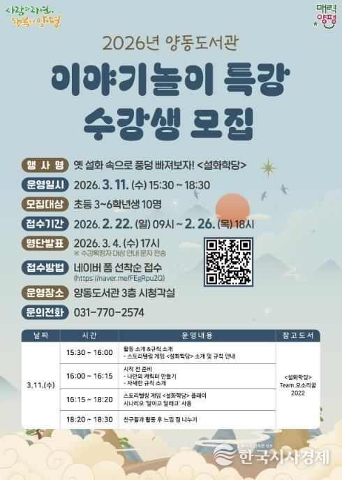 한국시사경제 기동취재팀 | 양평군은 새 학기를 맞아 양동도서관에서 초등학생을 대상으로 운영하는 ‘이야기 놀이 특강’의 수강생을 오는 22일부터 26일까지 모집한다고 밝혔다.