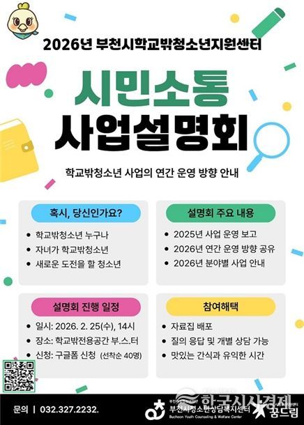 한국시사경제 경기취재본부 | 부천시학교밖청소년지원센터는 오는 2월 25일, 오후 2시 학교밖청소년 전용공간 부.스.터. (송내어울마당 1층)에서 시민과의 소통을 확대하고 2026년 연간 운영계획을 공유하는 ‘사업설명회’를 개최한다고 밝혔다.