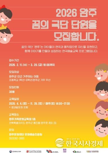한국시사경제 전북취재본부 | (재)완주문화재단(이사장 유희태)은 완주군, 한국문화예술교육진흥원과 함께 추진하는 '꿈의 무용단 in 완주'와 '꿈의 극단‘완주’'의 2026 단원을 모집한다. 두 프로그램 모두 완주군 및 인근 거주 초등 1~6학년 아동(완주군 거주 우선)을 대상으로 하며, 각 30명(사회적 배려계층 40% 우대)을 선발한다.